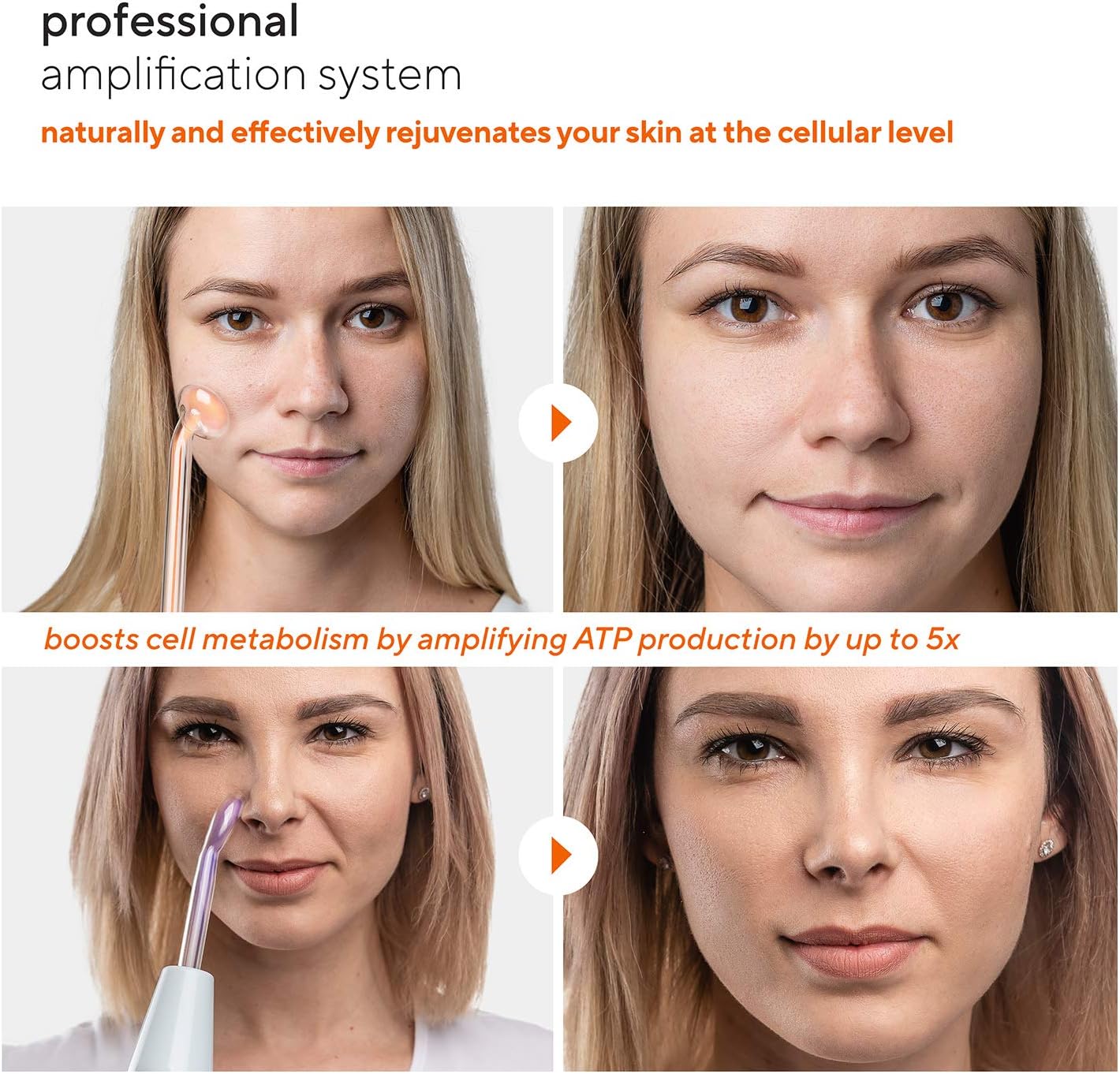 - Applicatori specializzati per sessioni total body: la versione professionale è dotata di applicatori in vetro specializzati, come un applicatore a Y che può essere applicato comodamente su zone come braccia e collo, o un applicatore a bacchetta che funziona su aree più ampie come guance e fronte. Un applicatore a pettine superpotente è perfetto per energizzare cuoio capelluto e capelli.