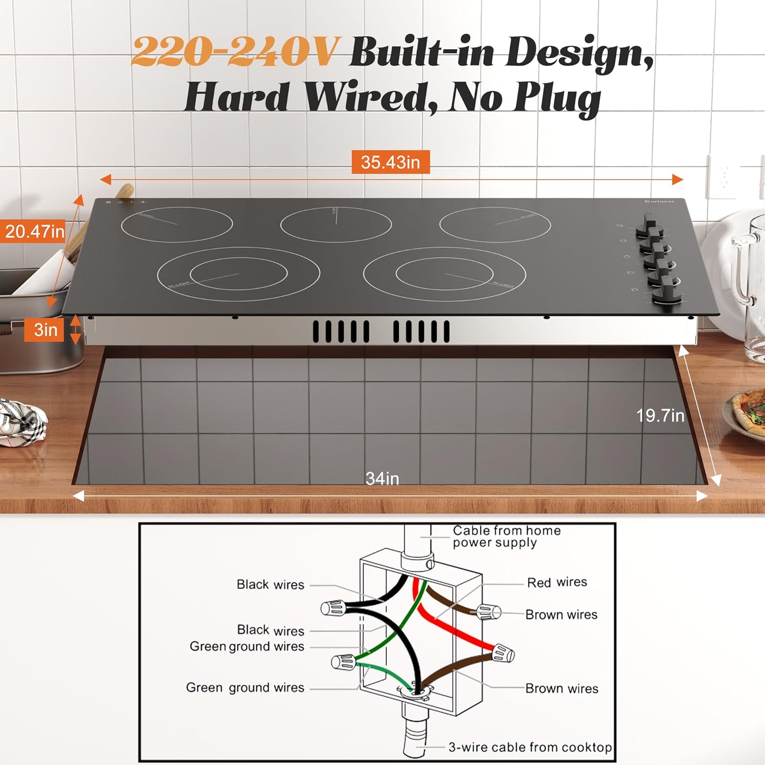 - 【9 livelli di potenza e piano cottura elettrico 220v-240v】Il piano cottura in ceramica da 30" è dotato di 4 potenti bruciatori: 1200W+1200W+1800W+1250/2500W (doppio). Ogni bruciatore del piano cottura elettrico a incasso ha 9 livelli di potenza, ruotando la manopola per controllare la potenza da 0 a 9 livelli, perfetto per brasare, friggere, friggere in padella, arrostire e altro ancora. Il piano cottura elettrico da incasso richiede un cablaggio professionale a 220-240V, SENZA spina.
