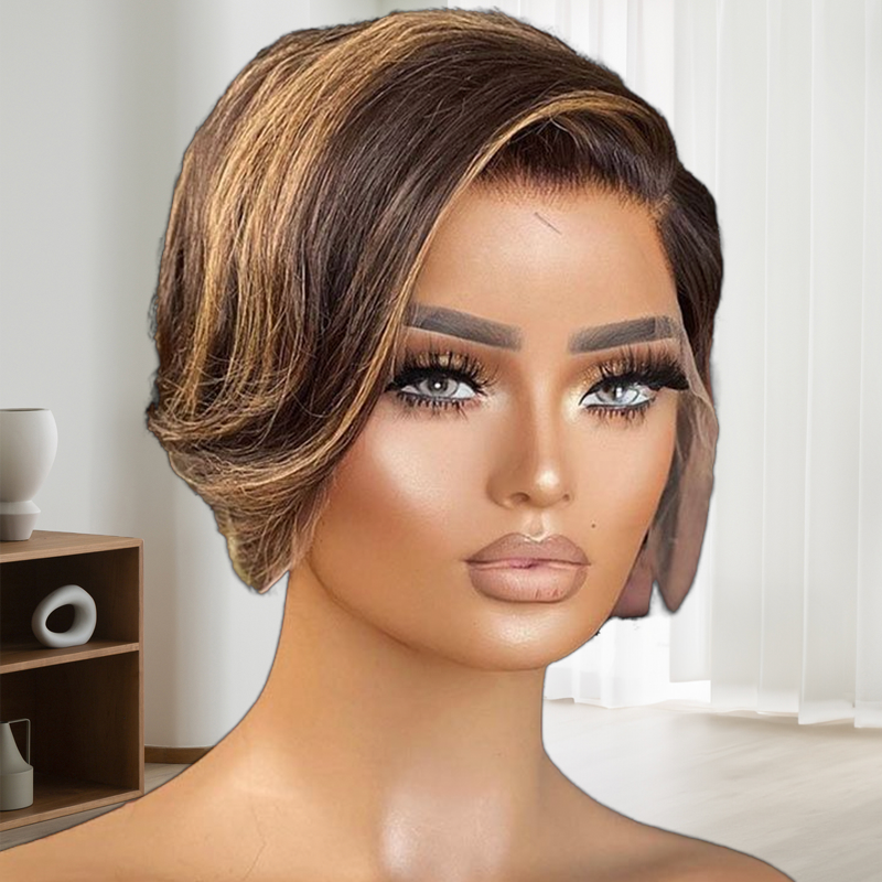Parrucca con taglio pixie e capelli umani lisci, parrucca caschetto frontale in pizzo