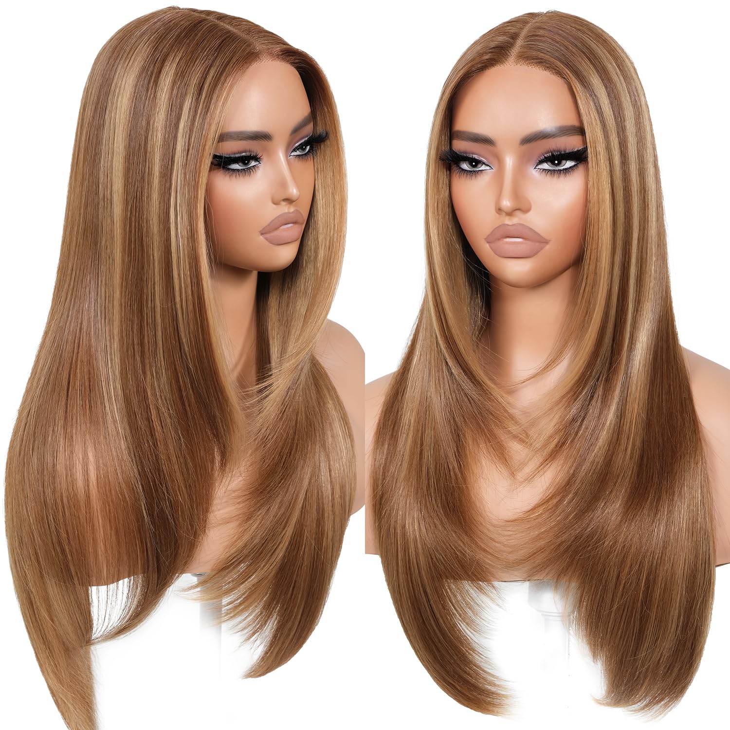 Parrucche senza colla pre-pizzicate e pre-tagliate per principianti, parrucche sintetiche biondo miele con pizzo frontale per donna, parrucche lunghe e lisce a strati