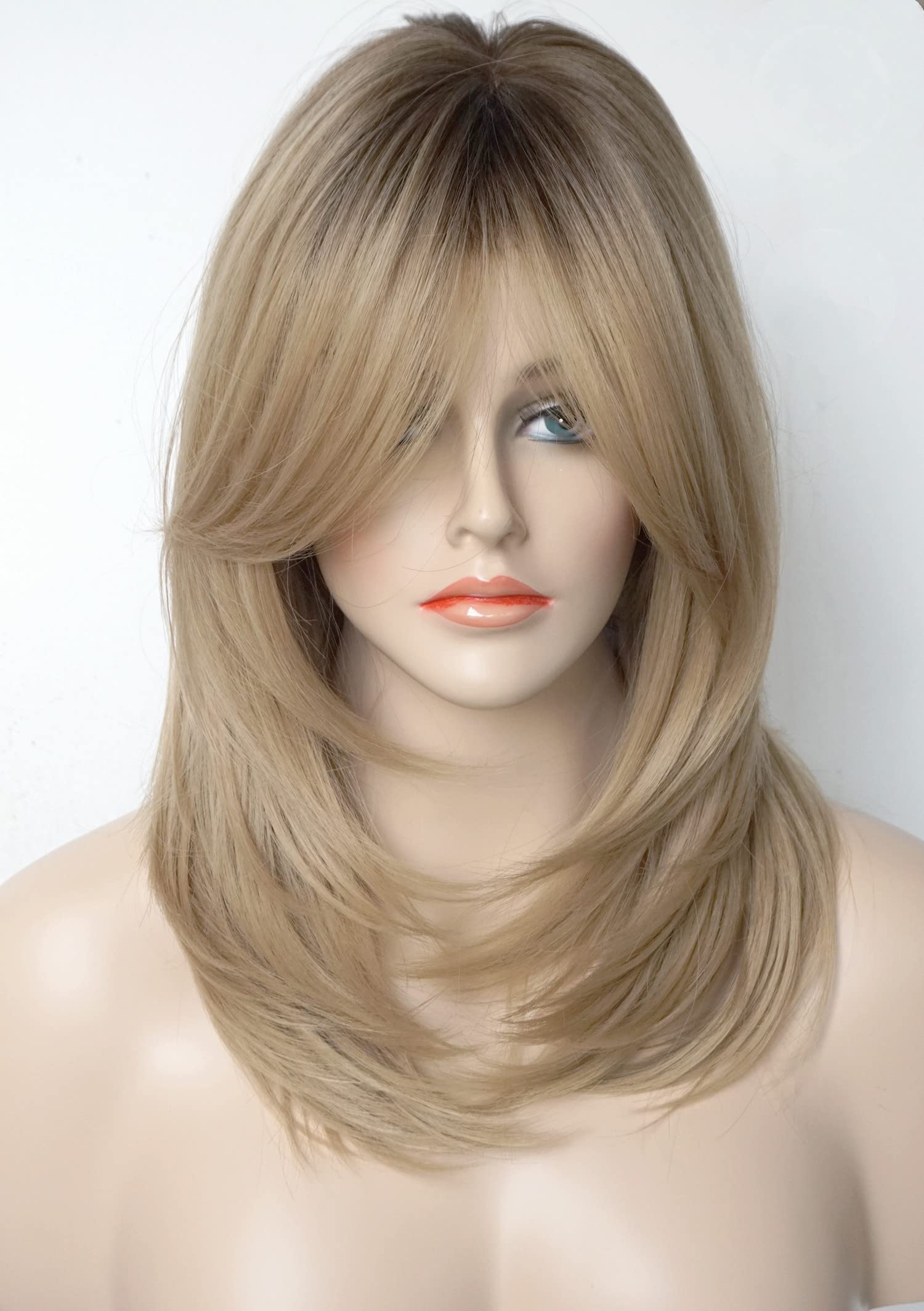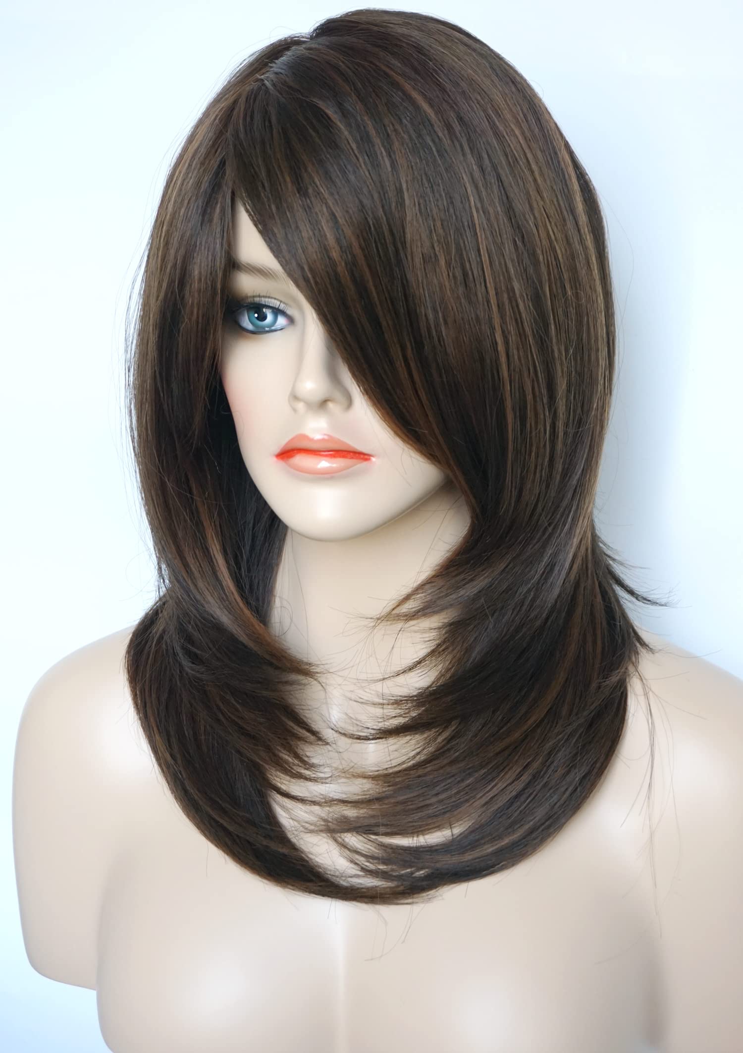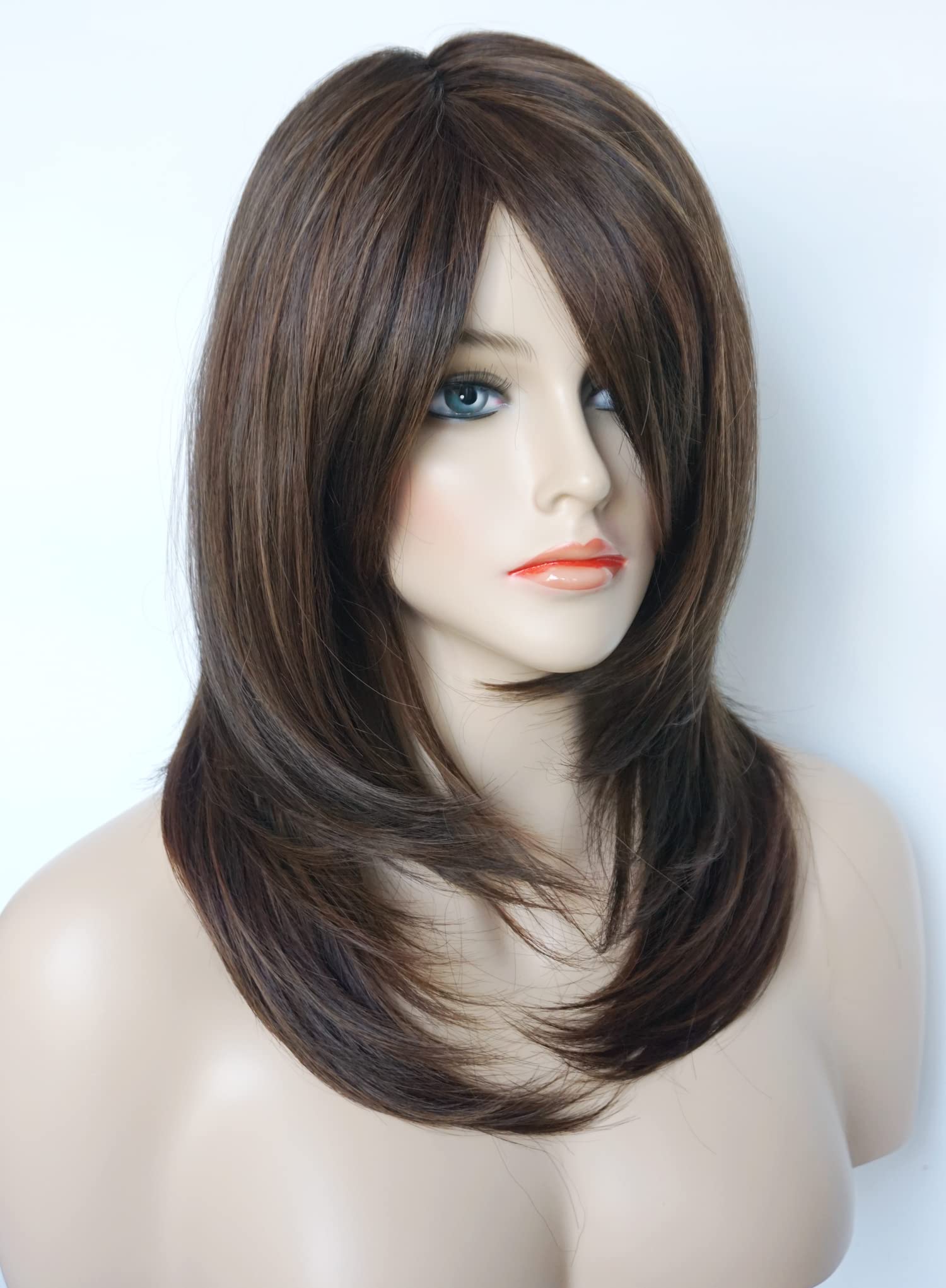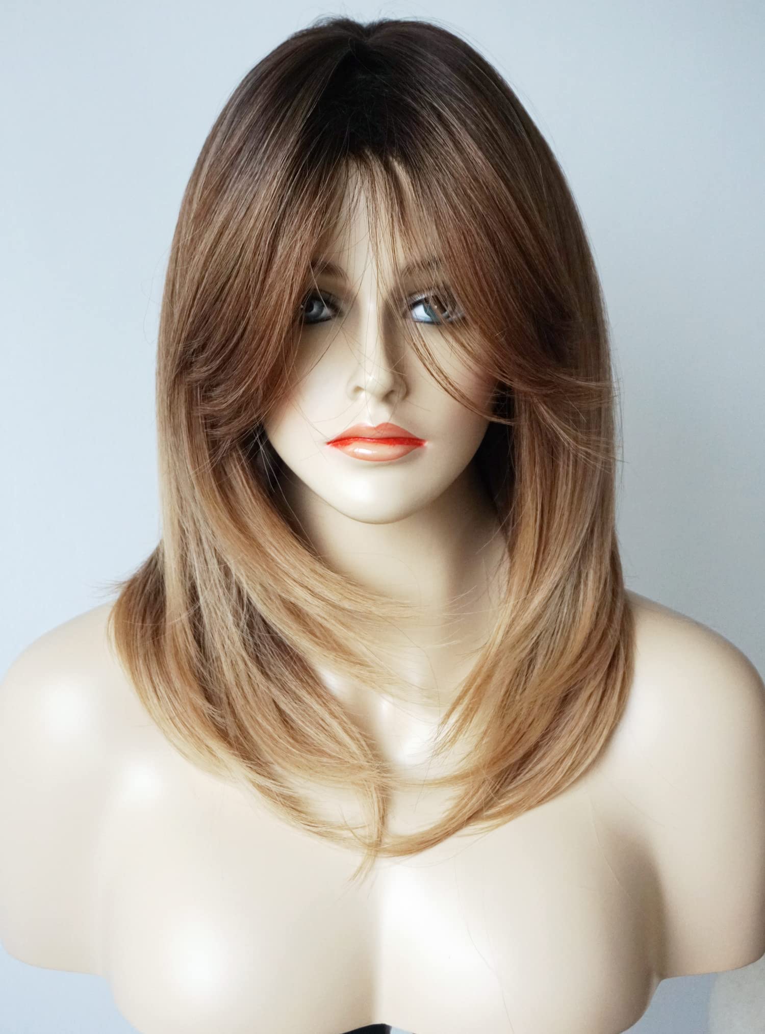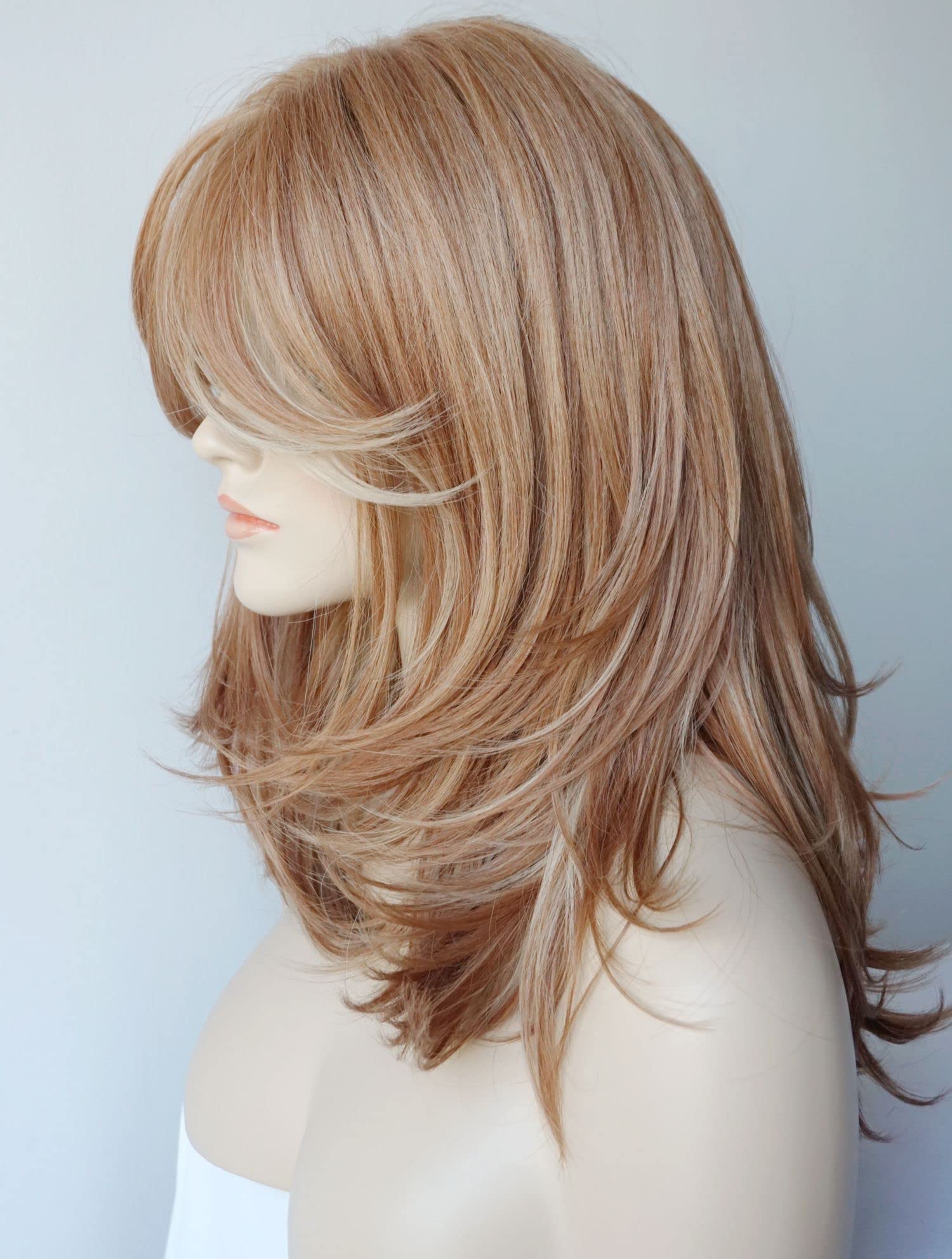 Parrucche da donna per donne bianche Parrucca di media lunghezza Parrucche a strati Colore castano chiaro con frangia Parrucca sintetica per donne