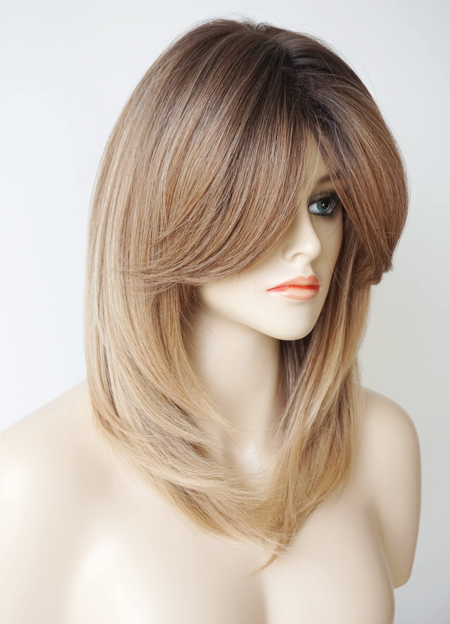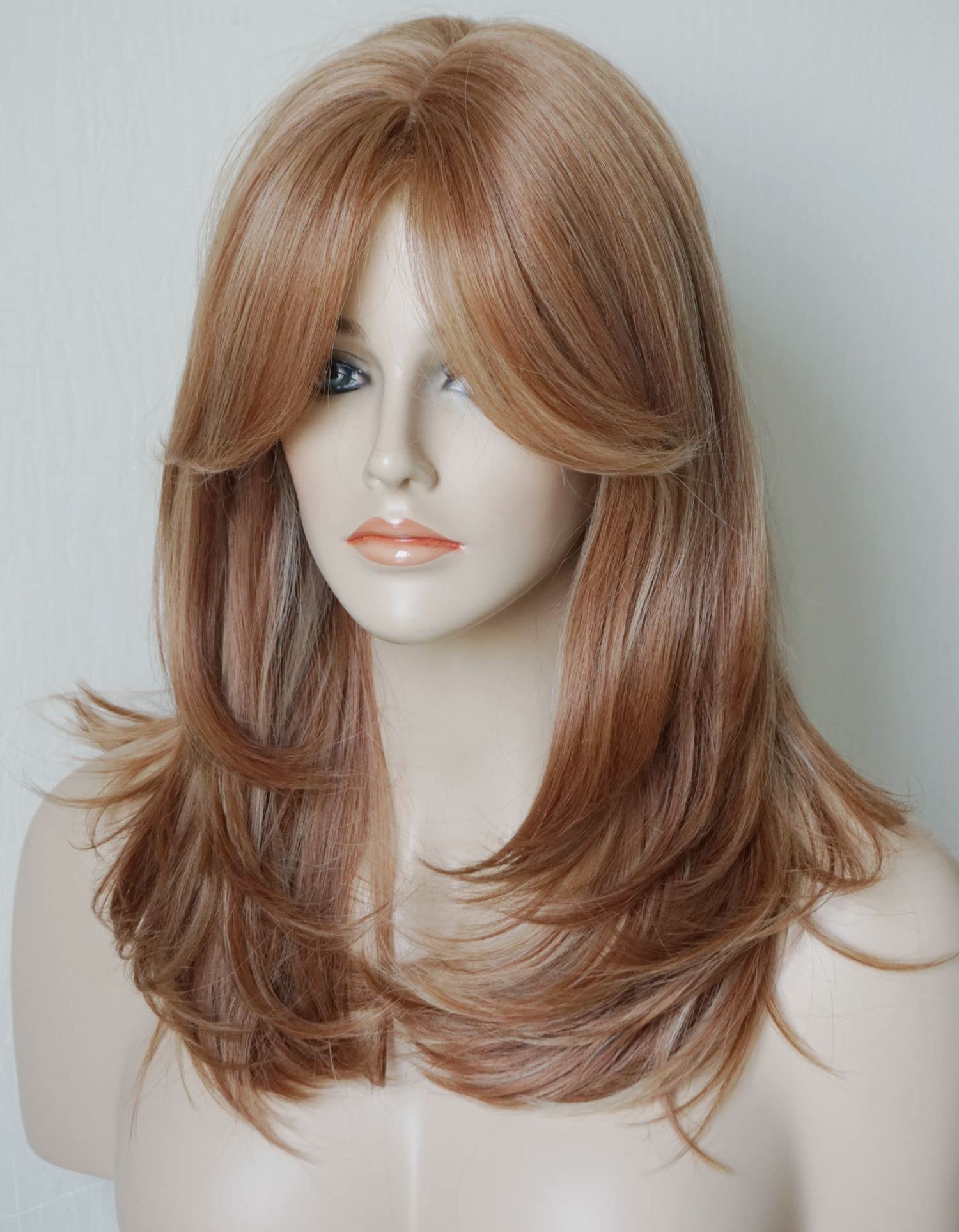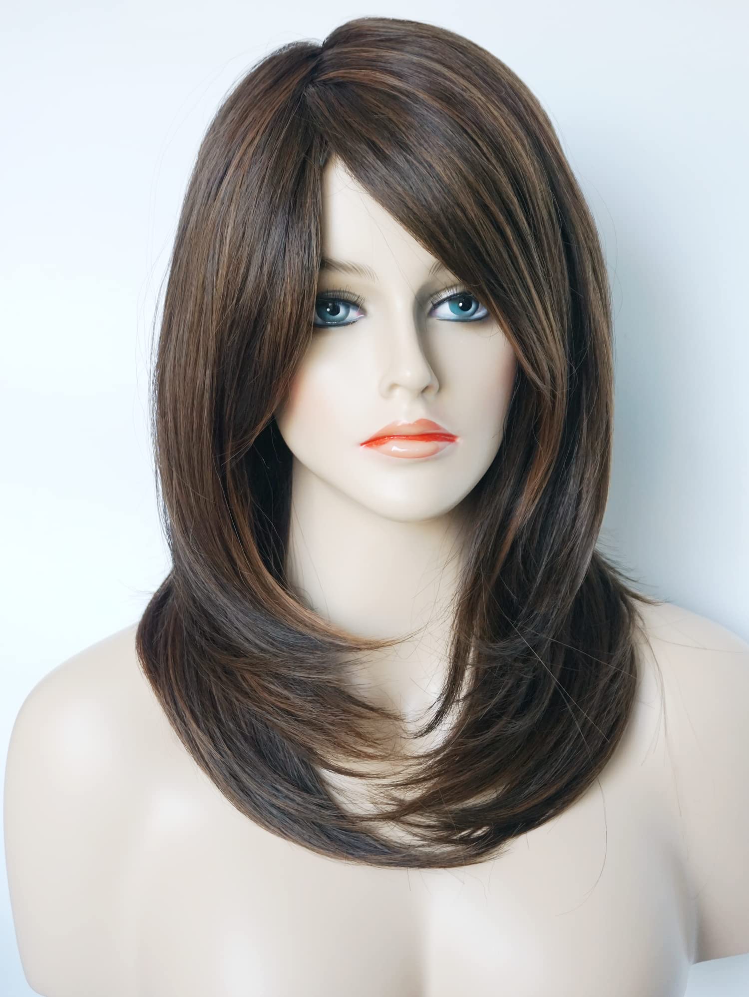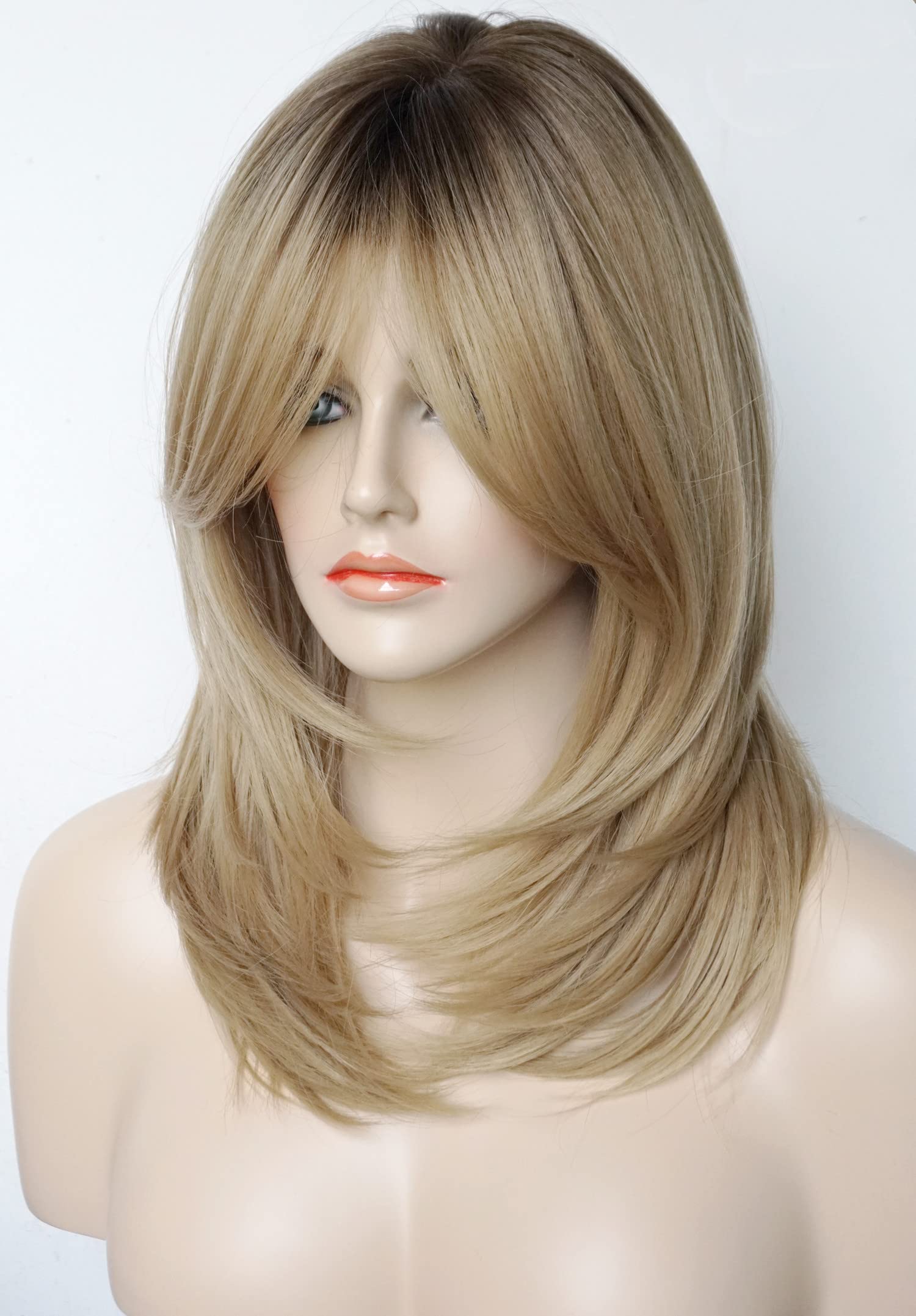 Parrucche da donna per donne bianche Parrucca di media lunghezza Parrucche a strati Colore castano chiaro con frangia Parrucca sintetica per donne