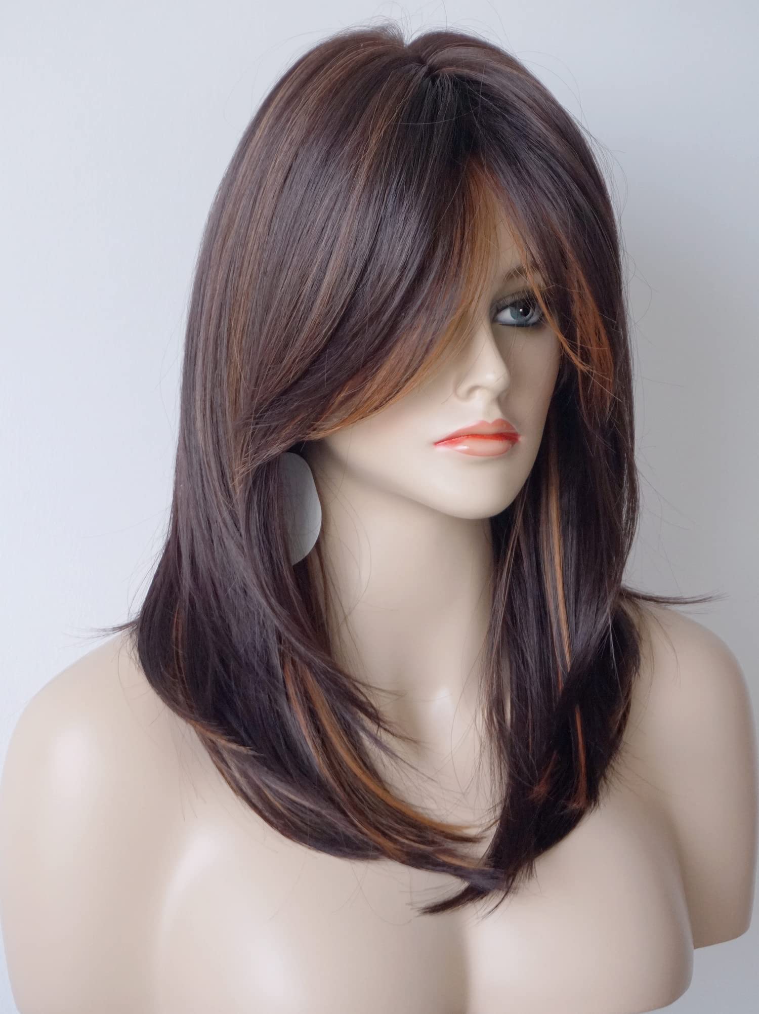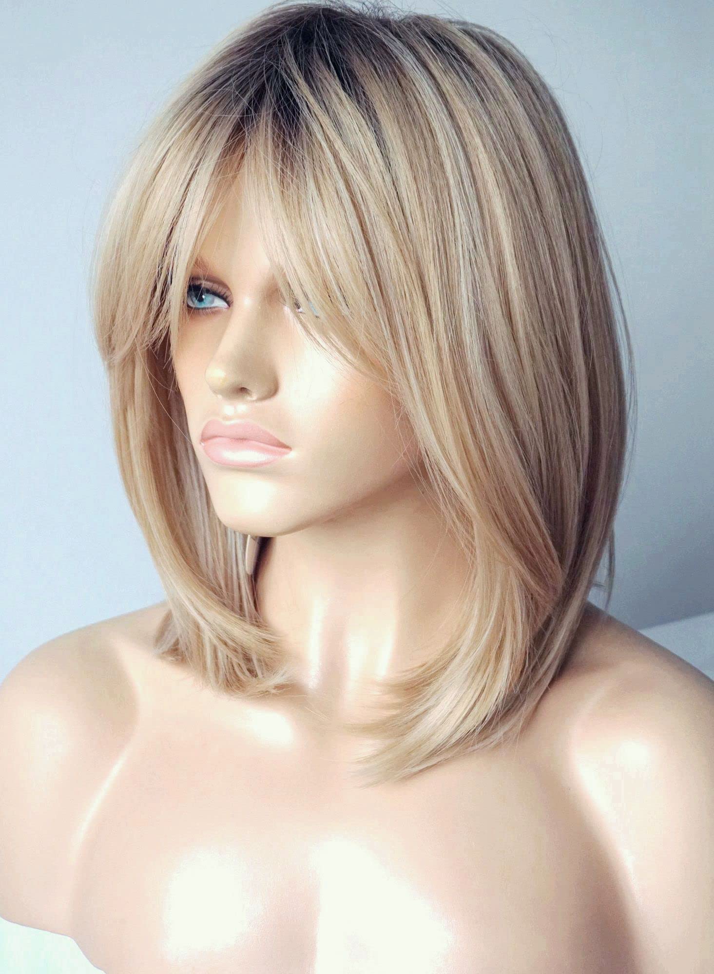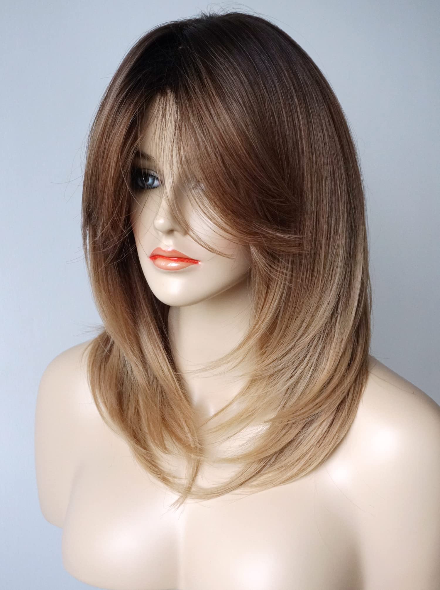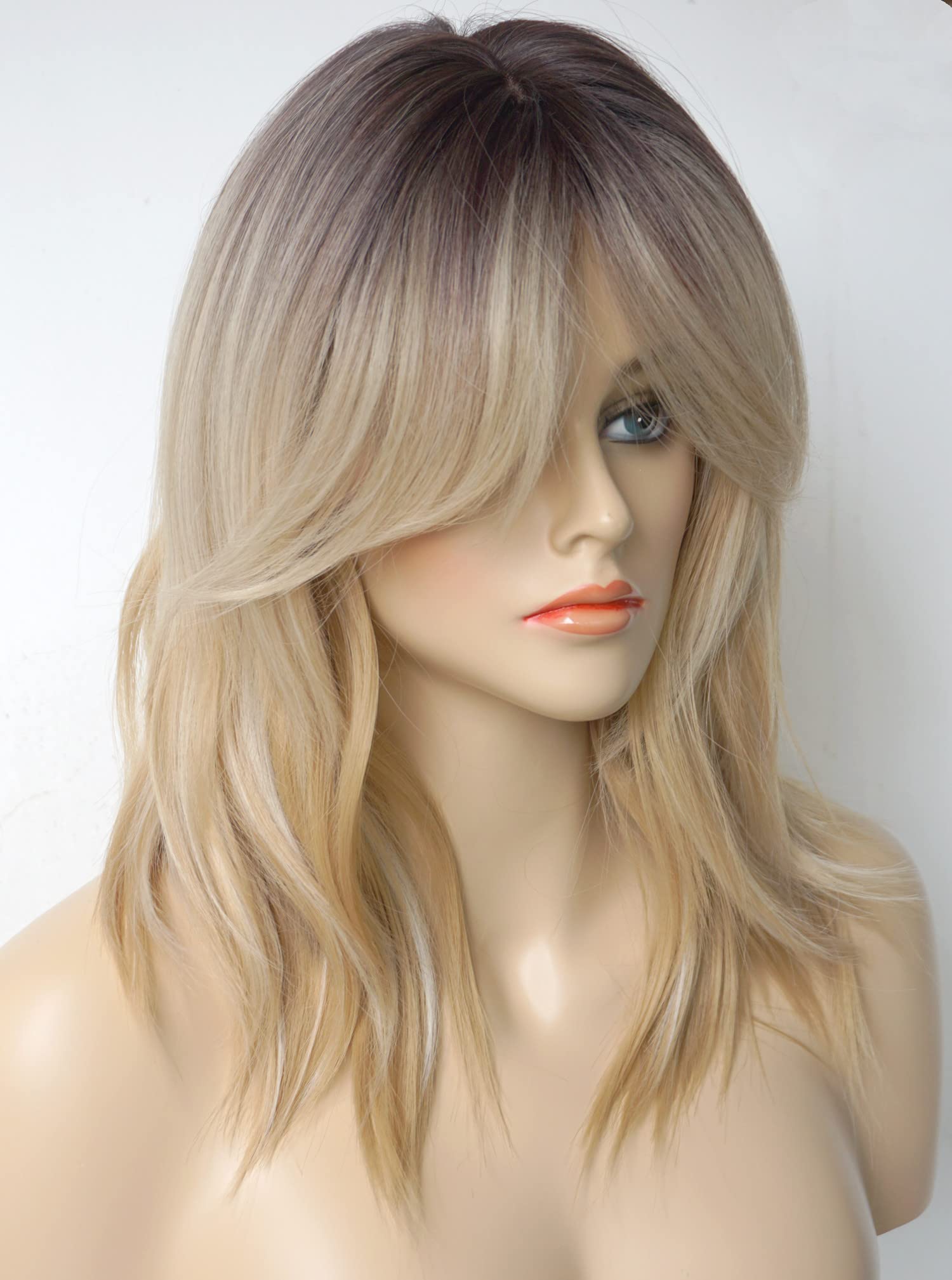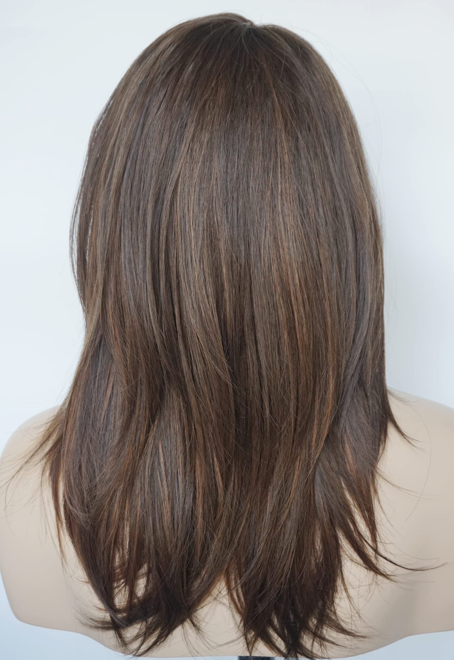 Parrucche da donna per donne bianche Parrucca di media lunghezza Parrucche a strati Colore castano chiaro con frangia Parrucca sintetica per donne