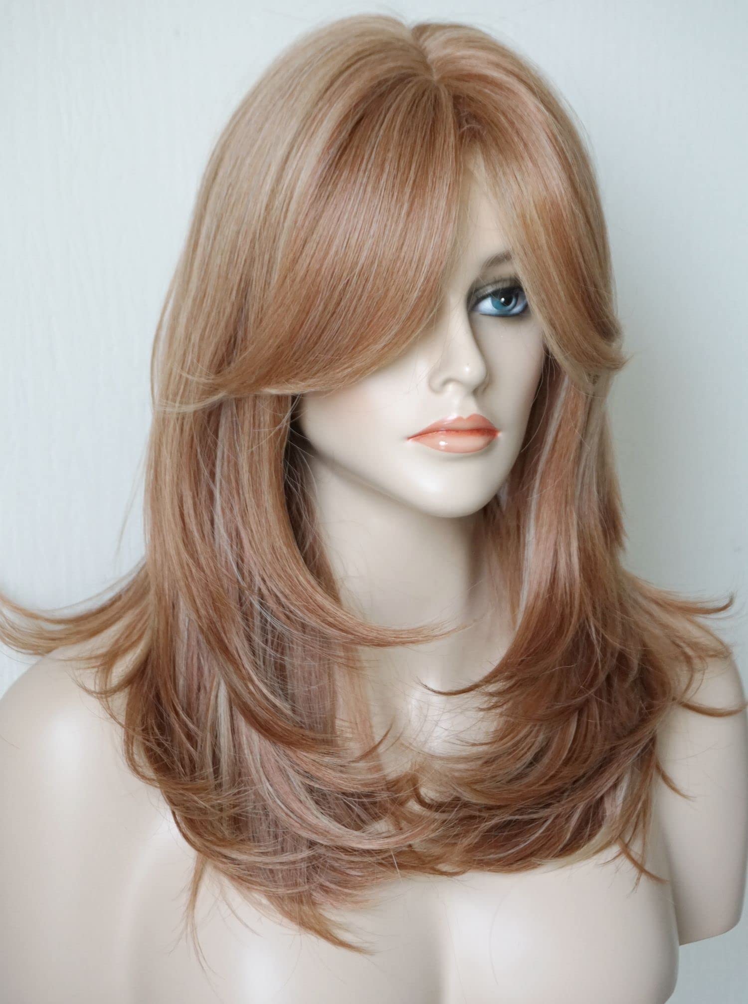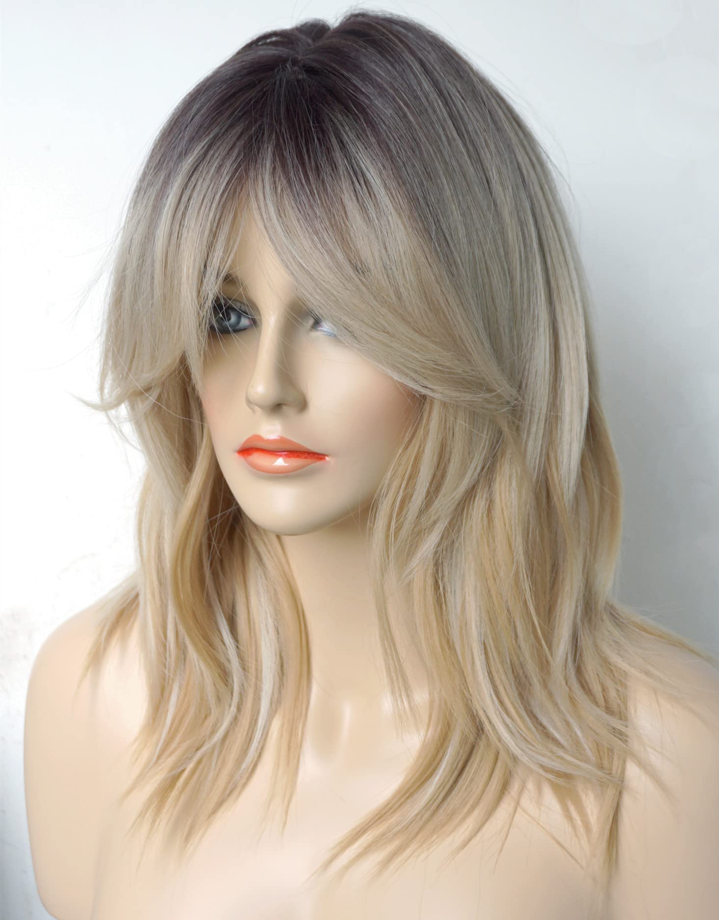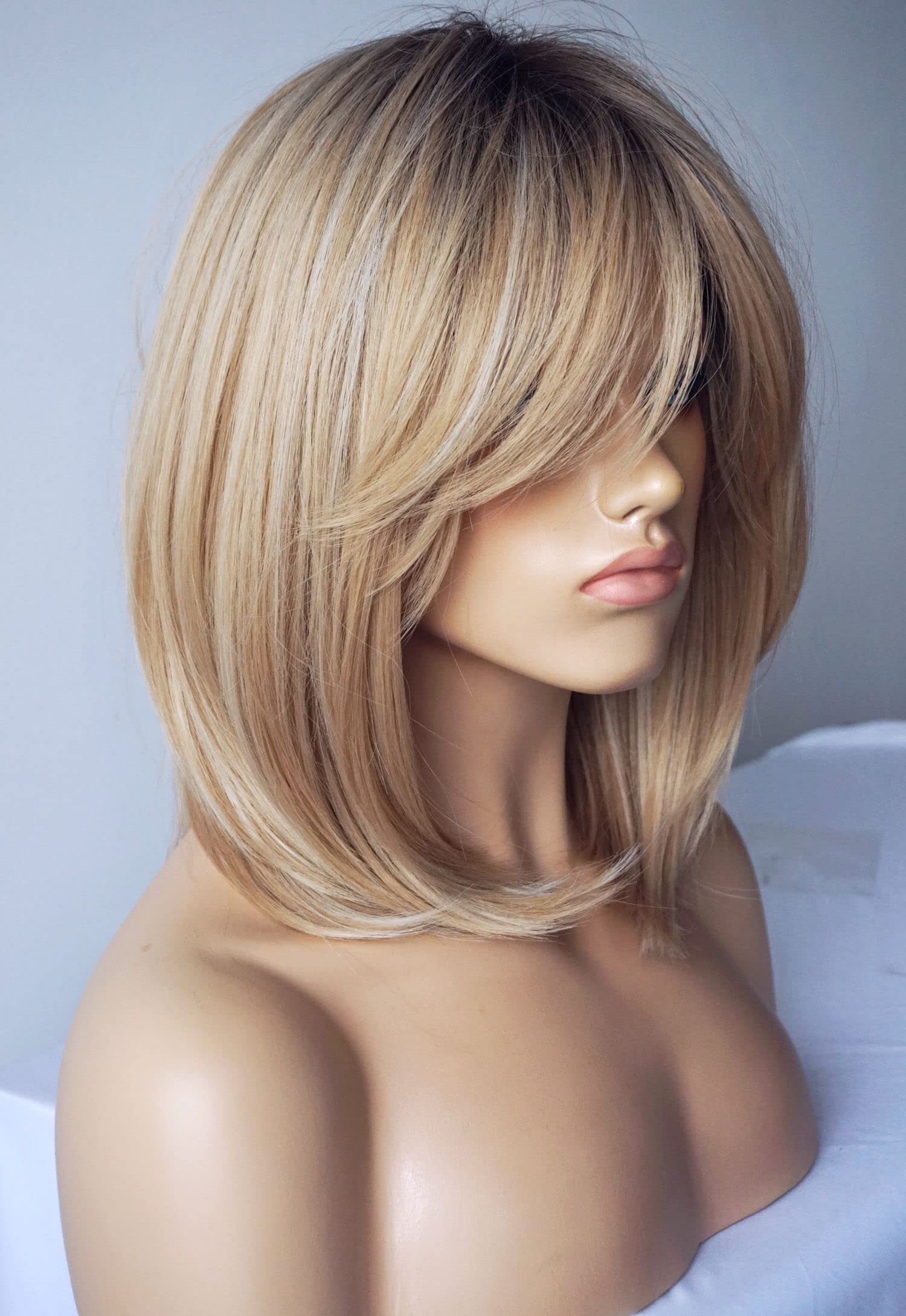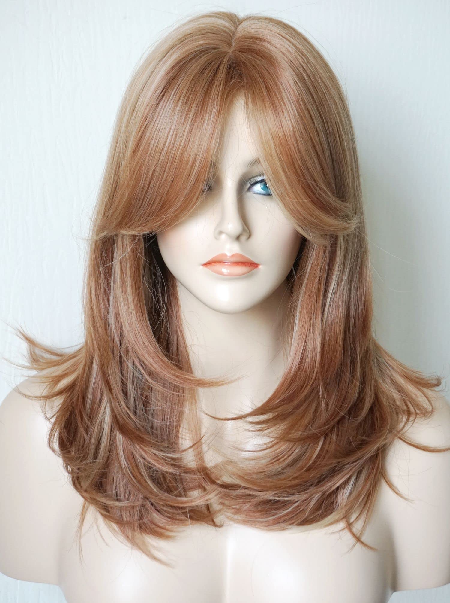 Parrucche da donna per donne bianche Parrucca di media lunghezza Parrucche a strati Colore castano chiaro con frangia Parrucca sintetica per donne