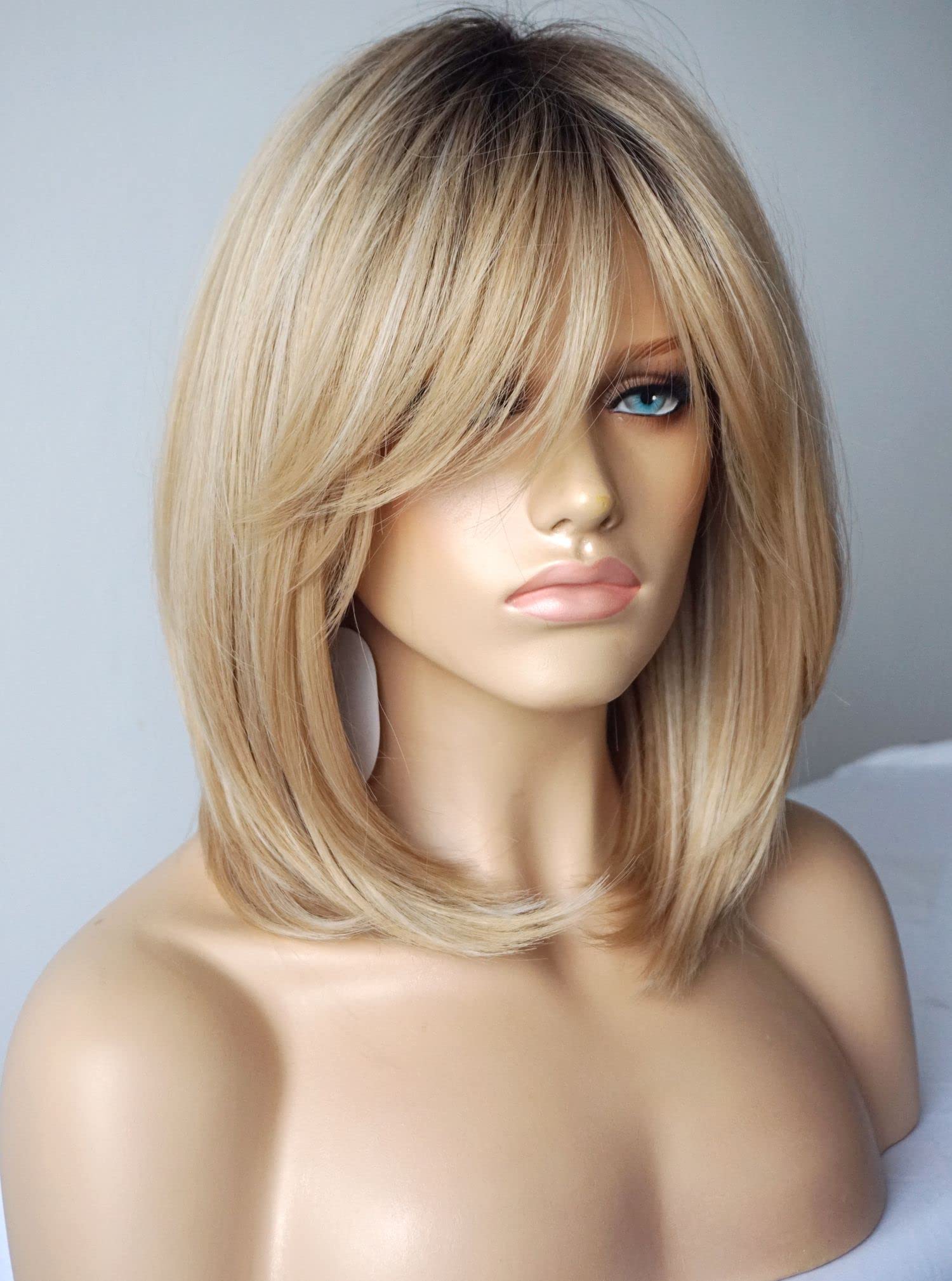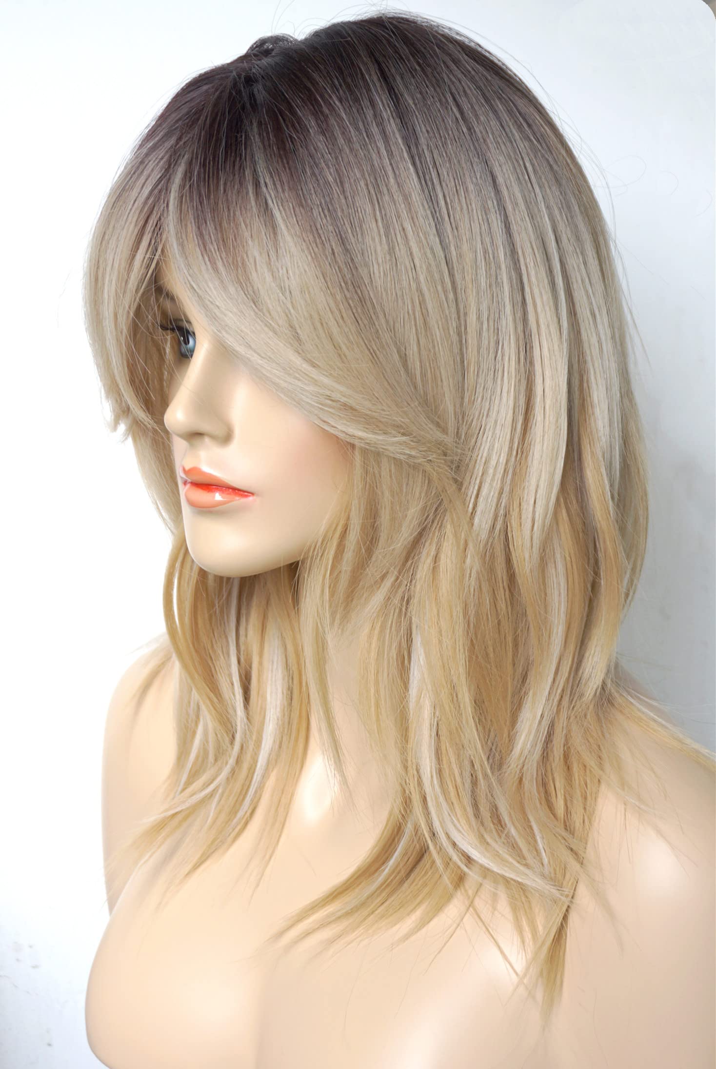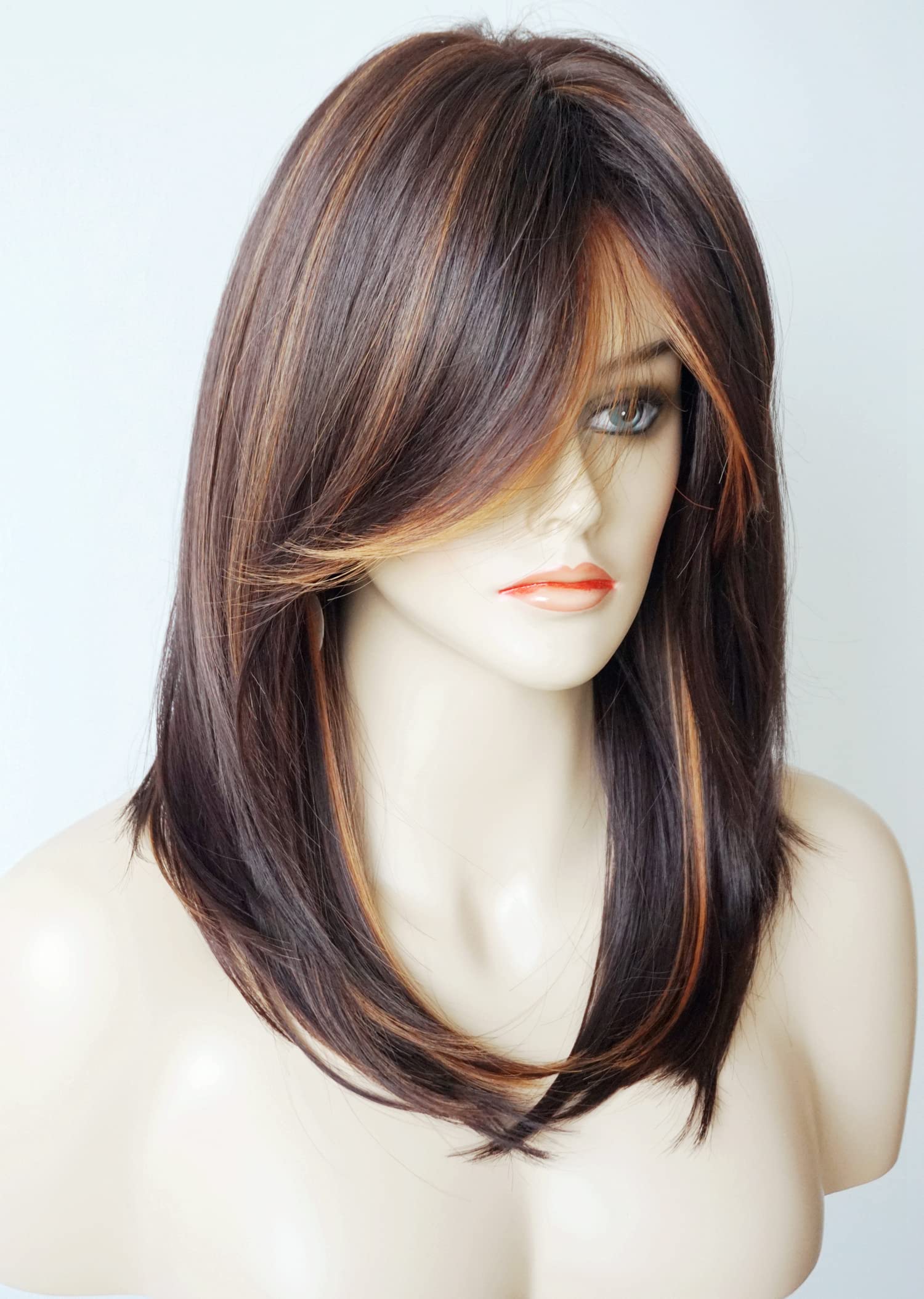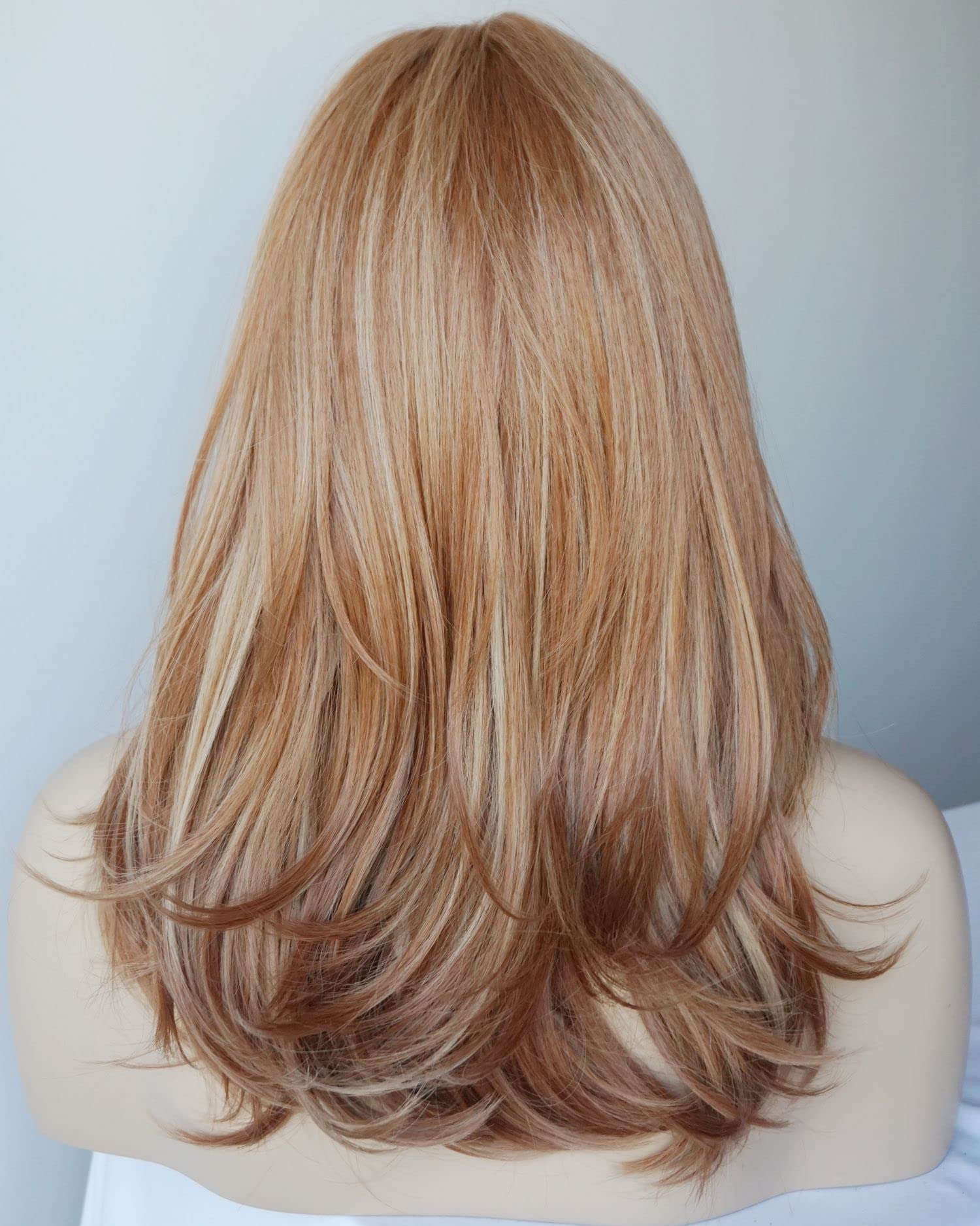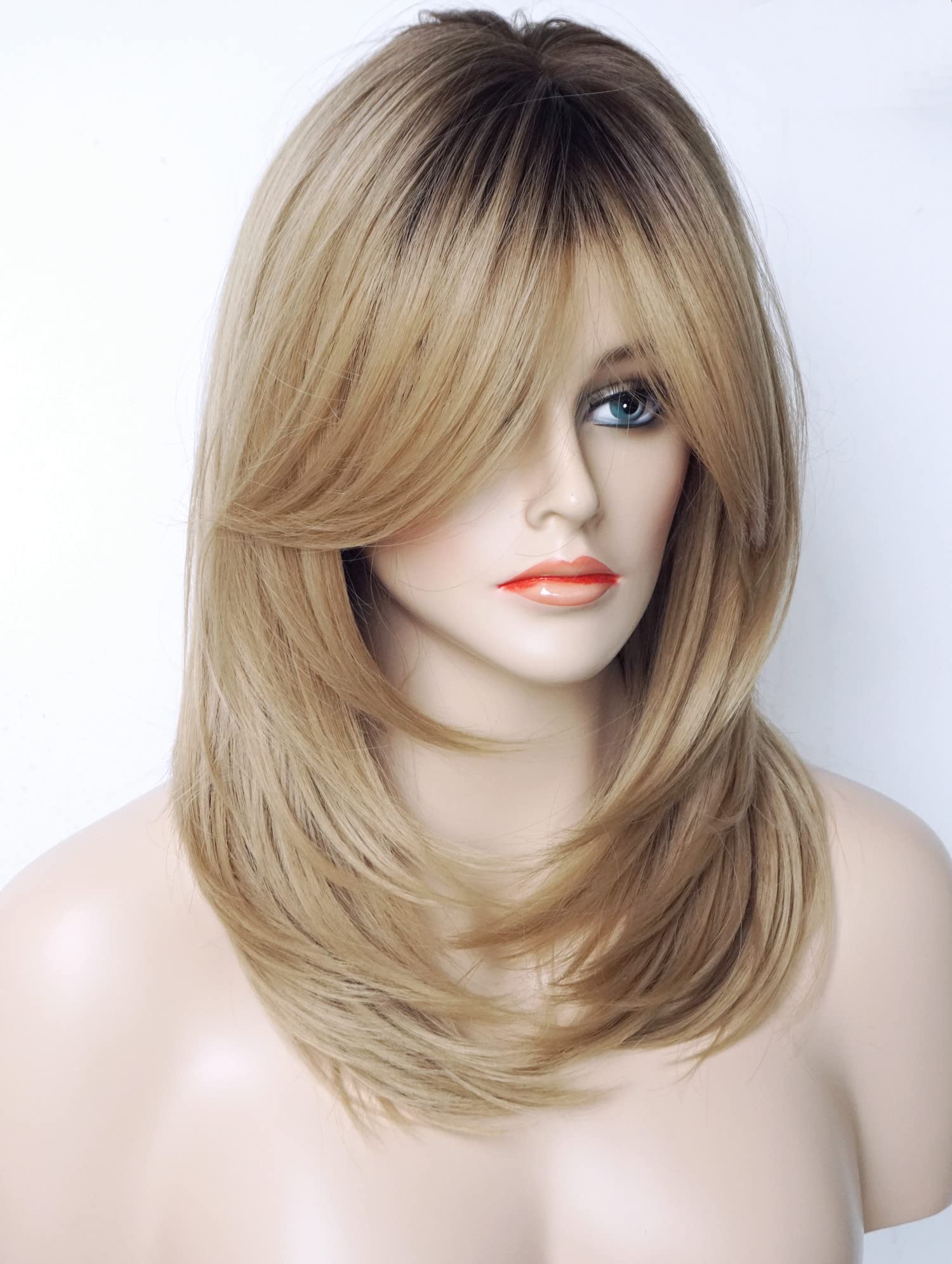 Parrucche da donna per donne bianche Parrucca di media lunghezza Parrucche a strati Colore castano chiaro con frangia Parrucca sintetica per donne